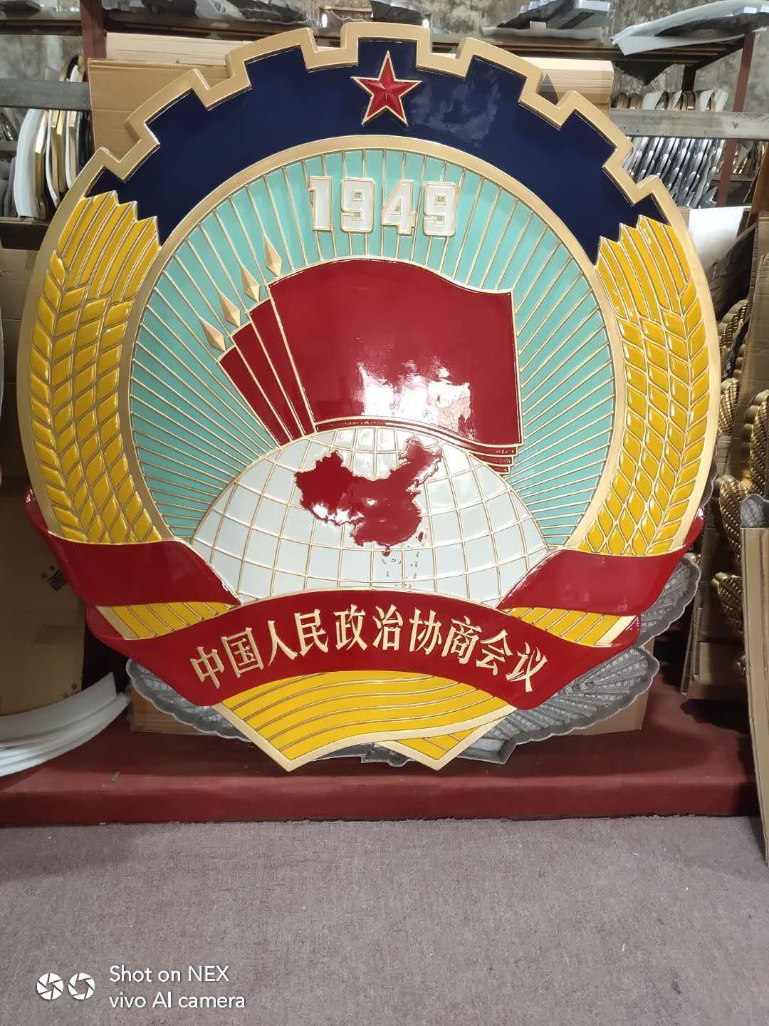 背景光芒四射。此外,紅星下面“1949”四個(gè)阿拉伯?dāng)?shù)字,表示中國(guó)人民政治協(xié)商會(huì)議誕生的年號(hào);緞帶上的“中國(guó)人民政治協(xié)商會(huì)議”10個(gè)金色仿宋字,標(biāo)明了人民政協(xié)的全稱。這個(gè)設(shè)計(jì)圖案經(jīng)周恩來(lái)批示交新政協(xié)籌備會(huì)常務(wù)委員們傳閱后,認(rèn)為較好地體現(xiàn)了籌備會(huì)提出的指導(dǎo)思想。后經(jīng)籌備會(huì)常務(wù)委員會(huì)主任毛澤東批準(zhǔn),在1949年9月21日開(kāi)幕的中國(guó)人民政治協(xié)商會(huì)議第一屆全體會(huì)議上正式使用。